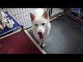BUSCUIT-Girl arrived at the rescue on Tuesday, 25th February and is such a larger tha life character. She was listed as a white GSD, however, she is definitely more husky looking with the smaller ears and smaller frame, of course no way of knowing, maybe a mix of both breeds. She likes to talk, as do both huskies and shepherds and when she is being ignored can be quite vocal - true to both breeds. She is young, highly active, intelligent and full of energy.