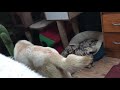He has been in the bedroom with some cats and seemed to have not encountered them before, showing a huge curiosity but also respect for these unknown hissing creatures. As he spent more time in with them, he got more relaxed and did chase a few times when a cat ran. There are several video's on his page on the rescue website showing him in with the cats. It is very important to understand that this does not mean he is "good with cats" it was all very new and he was testing the waters and so we are not comfortable by any means to say he would be safe with cats. The Jindo breed is known for having a high prey drive!