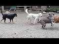We are not able to say how the dogs are around cats, small children or livestock. It is up to families to take all precautions and be prepared to work on training, mutual respect and providing safe place for other animals for potential long term.
